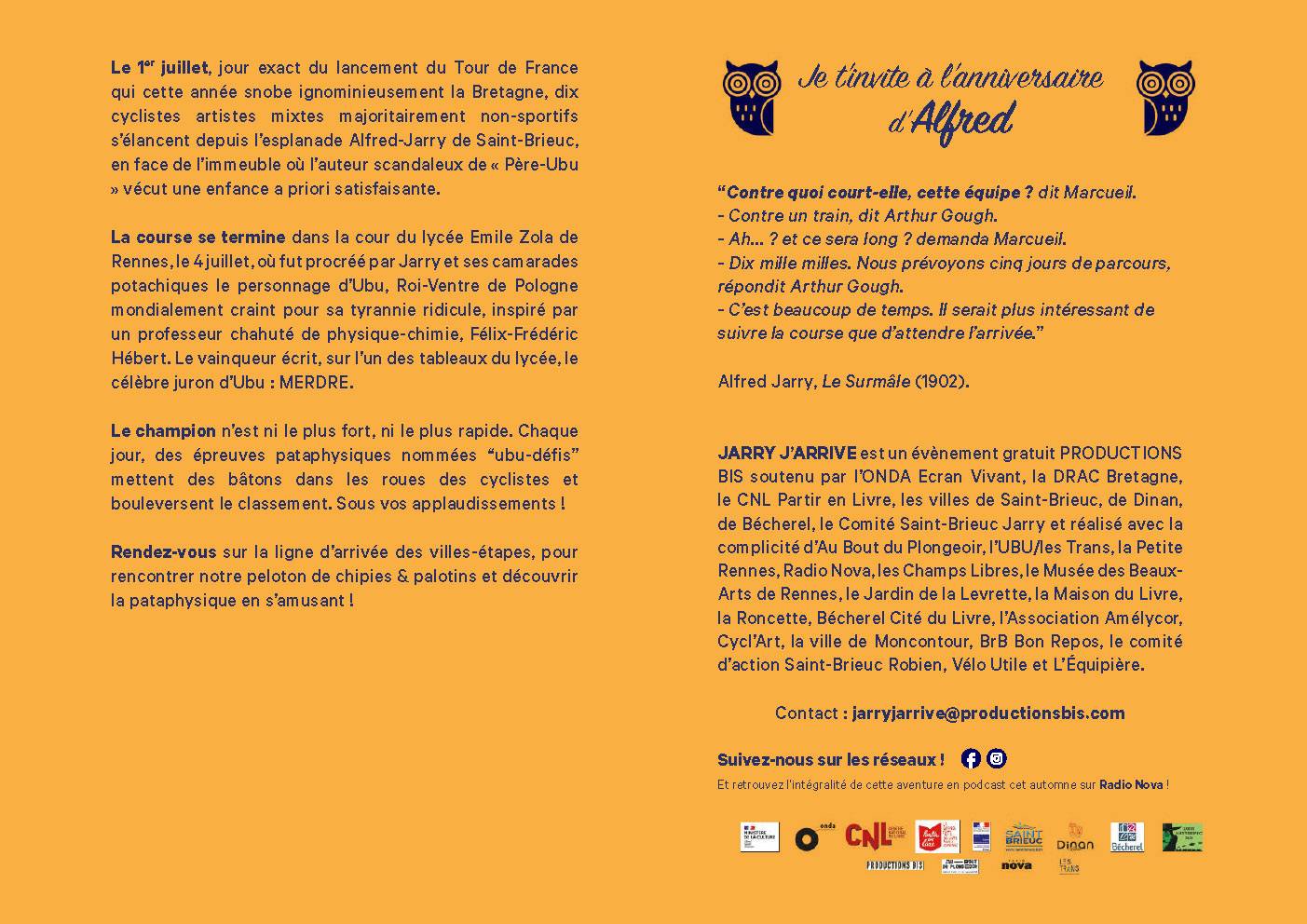 Alfred Jarry , poète et inventeur de la science pataphysique, était un pratiquant fanatique de la bicyclette. Aussi pour marcher dans ses pas, lui rendre hommage et retrouver le goût de son oeuvre, nous nous proposons d'organiser une course cycliste sur les routes de sa jeunesse, 150 ans après sa naissance, en juillet 2023. Le départ sera donné de la place Alfred Jarry à Saint Brieuc et le parcours se terminera à Rennes. Les 34 concurrents devront s'arrêter toutes les deux heures dans les villages étapes afin de rivaliser lors d'épreuves de pataphysique.
