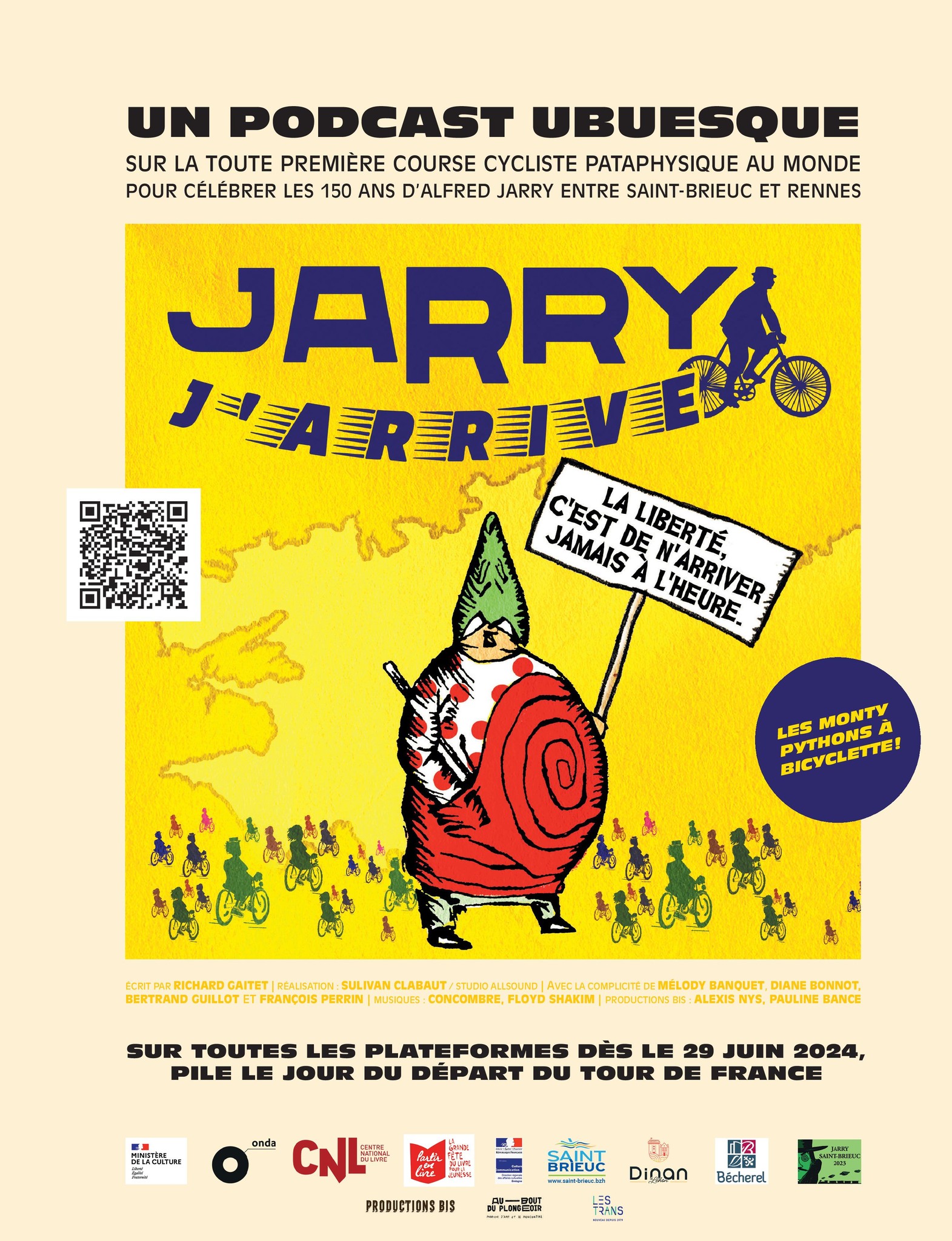 Le 1er juillet, jour exact du lancement du Tour de France qui snobe ignominieusement la Bretagne, 10 cyclistes artistes mixtes majoritairement non sportifs s'élancent depuis l'esplanade Alfred Jarry de Saint brieuc, en face de l'immeuble où l'auteur scandaleux du "Père UBU" vécu une enfance à priori satisfaisante...